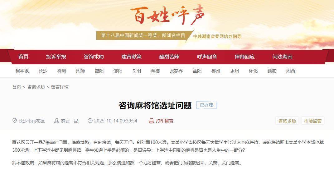 红网时刻新闻10月23日讯(记者 陈星晓)近日,有网友在红网《百姓呼声》栏目反映,长沙市雨花区一麻将馆位于泰禹小学附近,每天大量学生经过这个麻将馆,担心会对未成年人产生不良影响。并希望相关部门如发现此麻将馆经营不符合相关规定,能责令其搬迁或采取隐蔽措施。后续,得到专业律师回应。